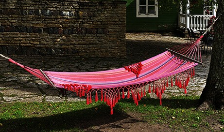 Kiedy już zdecydujesz się na hamak w ogrodzie lub w domu, przyjdzie kolej na to, aby go zamontować. Jak poprawnie tego dokonać? W pierwszej kolejności zastanów się, na jakiej wysokości powieszony będzie hamak, a także jak daleko umieścisz jego końce od ścian lub innych obiektów. Zwykle zaleca się, aby odległość między punktami zaczepienia wynosiła 5 – 6 metrów. Następnie weź dwa kawałki grubej liny lub łańcucha oraz analogiczną ilość karabińczyków. Dopasuj do siebie te elementy, wyreguluj naciągnięcie oraz przymocuj do obiektów zaczepienia. Pamiętaj przy tym, aby zostawić trochę zapasu. Bardzo prawdopodobne bowiem, że hamak wydłuży się w czasie użytkowania, szczególnie, gdy wykonany jest z naturalnego materiału.